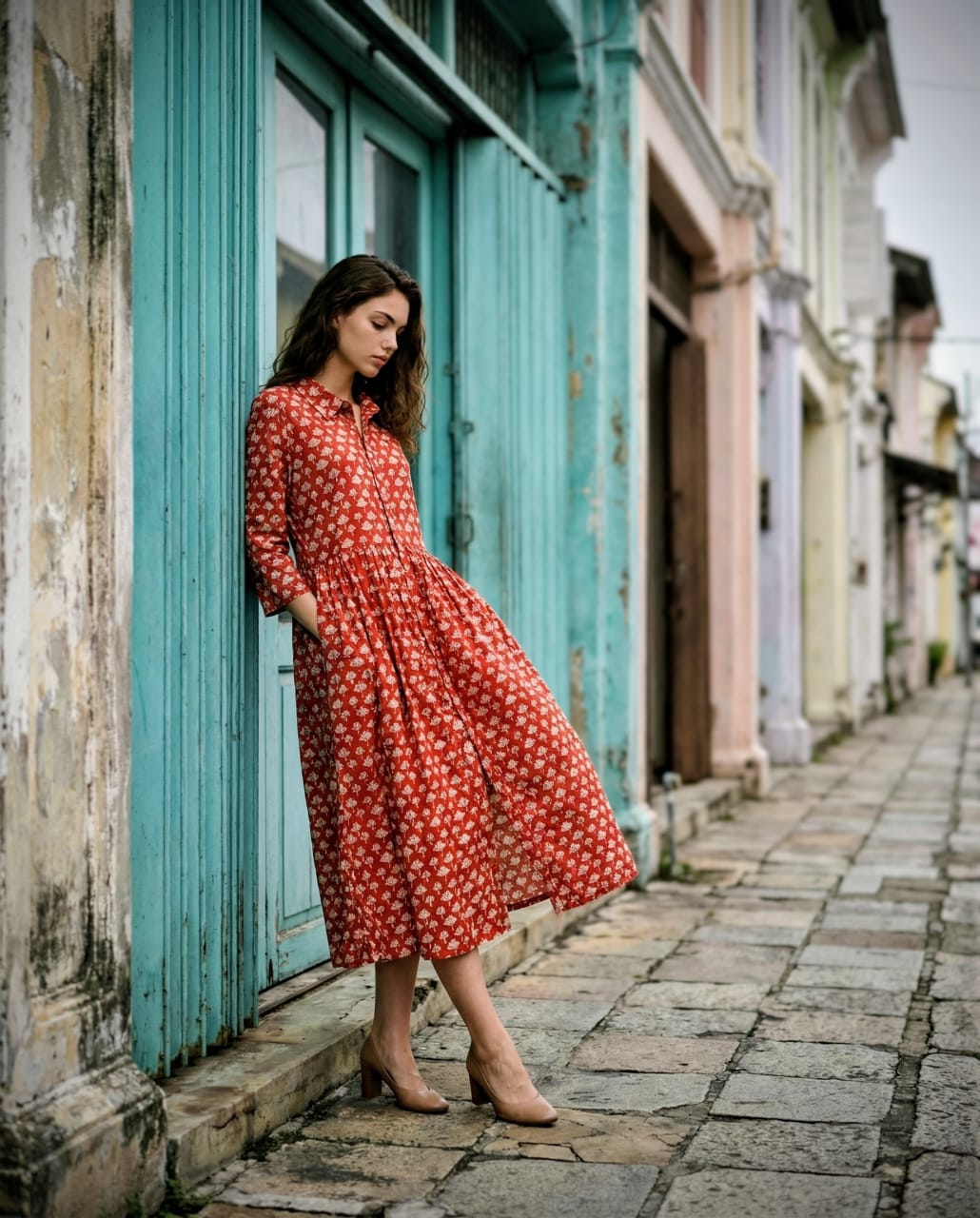 Printed cotton yoke dress - brick red